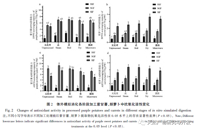 The main cooking methods for vegetables in China include stir frying, deep frying, boiling, steaming, etc. Among them, the oil content of stir frying and deep frying methods is generally high, while boiling and steaming methods can achieve low oil cooking. Different processing methods also have a certain impact on the phytochemicals contained in the diet. However, there are currently few reports on evaluating the phytochemicals and antioxidant activity of fruits and vegetables processed using different processing methods and compounded in different proportions. Relevant studies focus on the changes in phytochemical activity in fruits and vegetables before and after processing, and there are no reports on the compounding of processed fruit and vegetable extracts. This experiment treated purple sweet potatoes and carrots with different heat processing methods, and measured the content of phytochemicals in purple sweet potatoes and carrots before and after processing, as well as the in vitro antioxidant activity of extracts; Mix the extracts in different proportions and evaluate their antioxidant effects after compounding; By simulating digestion in vitro, the changes in phytochemical content and antioxidant activity at different stages of digestion were measured and analyzed, providing methods and ideas for exploring scientific dietary ratios.