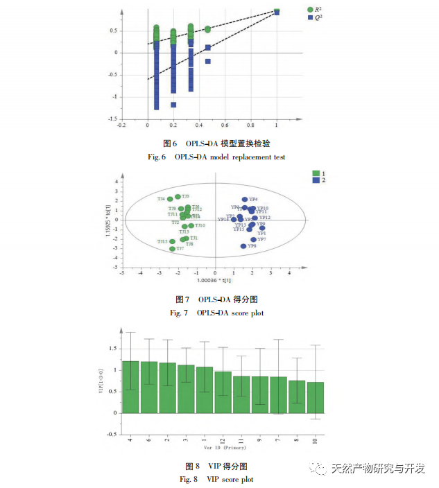 По результатам определения скорости переноса средняя скорость переноса трех флавоноидов варьировалась от 40% до 60%, при этом витексин имел самую высокую скорость переноса, за ним следовали нарциссин и изовитексин, а общая скорость переноса была относительно стабильной. Результаты исследования спектра отпечатков пальцев показали, что пропорция пиков в отваре Bu Zha Ye по сравнению со стандартным отваром несколько изменилась. Анализ OPLS-DA выявил пять значительно отличающихся хроматографических пиков, а именно пики 1, 2, 3, 4 и 6. За исключением пика 3, который не был идентифицирован, все остальные хроматографические пики были известны. Среди них пики 1, 2 и 4 были компонентами фенольных кислот. Поэтому пик 3 предположительно является фенольной кислотой. Компоненты фенольных кислот - это особые компоненты растений, которые могут служить предшественниками для синтеза других соединений, а также могут быть гидролизованы из различных соединений. Поэтому значительное увеличение относительной площади пиков компонентов фенольных кислот в стандартном отваре Bu Zha Ye считается обусловленным гидролизом других компонентов в процессе отваривания. Структура пика 6 изовитексина схожа со структурой пика S изовитексина, с незначительной разницей в полярности, но имеется значительная разница в скорости переноса. Считается, что существует определенная степень взаимопревращения между изовитексином и изовитексином в процессе отваривания стандартного отвара, и необходимы дальнейшие исследования.