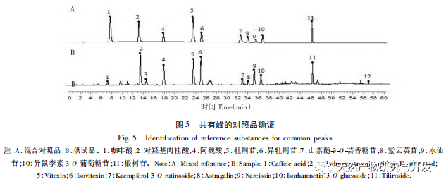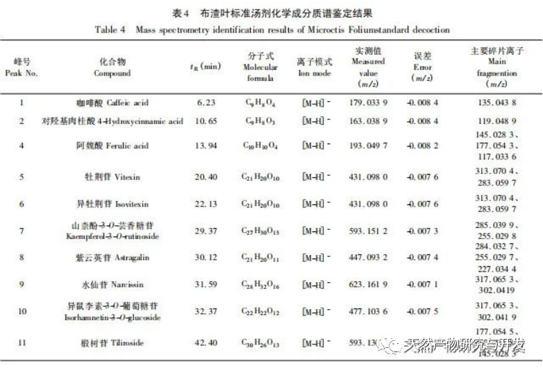Исследования показали, что листья Бу Чжа содержат большое количество флавоноидов. Сяо и др. успешно идентифицировали 31 соединение из Bu Zha Ye с помощью технологии UPLC-Q-TOF-MS/MS, включая 28 флавоноидов и 3 фенольные кислоты. Фармакологические исследования показали, что флавоноиды являются важной материальной основой для переваривания, усвоения, очищения от жара и избавления от сырости в Bu Zha Ye. Такие компоненты, как витексин, изовитексин и нарциссин, имеют высокое содержание в Bu Zha Ye и определенную растворимость в воде. Поэтому в стандартном отваре Бу Чжа Е витексин, изовитексин и нарциссин используются в качестве индикаторов определения содержания, а также устанавливается метод определения содержания компонентов отвара Бу Чжа Е на основе этого отвара, чтобы направить исследование передачи стандартных значений отвара.