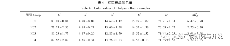 В данной статье в качестве объекта исследования взяты образцы астрагала красного разного цвета, с помощью прецизионного колориметра, LC-MS/MS и других методов определения определены цветовые значения образцов астрагала красного разного цвета и содержание 68 типов каротиноидных метаболитов (обнаружено 17 типов). Однофакторный дисперсионный анализ, PCA-анализ, кластерный анализ, корреляционный анализ, проекция важности переменных в модели OPLS-DA VIP и метод множественных значений разности применены для изучения изменений в цветовых значениях и каротиноидных метаболитах среди различных окрасок красного астрагала, а также для исследования корреляции между цветом красного астрагала и каротиноидными компонентами. Результаты показали, что значения L * для шести цветовых значений образцов коричнево-желтого, красновато-коричневого, красновато-коричневого и желто-коричневого красного астрагала варьировались от 75,38 до 85,41, значения a * варьировались от 3.95 до 5,16, значения b * варьировались от 11,52 до 15,91, значения C * варьировались от 12,31 до 16,53, значения h ° варьировались от 68,77 до 74,23, а значения общей разницы цвета Δ E * ab варьировались от 1,58 до 8,49. L * значение, b * значение, C * значение, h ° значение и общая цветовая разница Δ E * ab значение HC1 коричнево-желтый является самым высоким среди четырех цветов, HC2 красновато-коричневый имеет самое высокое a * значение среди четырех цветов, L * значение, h ° значение, и общая цветовая разница Δ E * ab значение является самым низким среди четырех цветов, и HC3 красновато-коричневый имеет самое низкое a * значение, b * значение и C * значение среди четырех цветов. Шесть значений цвета HC4 желто-коричневый распределены на промежуточном уровне. Между четырьмя группами образцов красного астрагала с разными цветами наблюдались значительные различия в значениях L *, a *, C *, h ° и Δ E * ab, а также значительная разница в значениях b *, что указывает на то, что цвета, субъективно оцениваемые невооруженным глазом, являются репрезентативными и могут отражать цветовые различия между образцами красного астрагала.