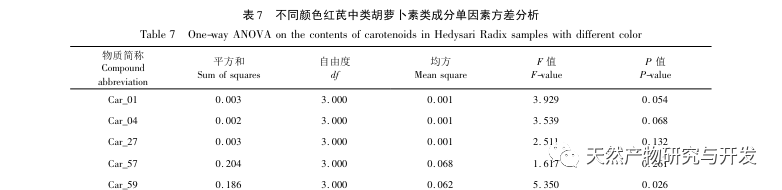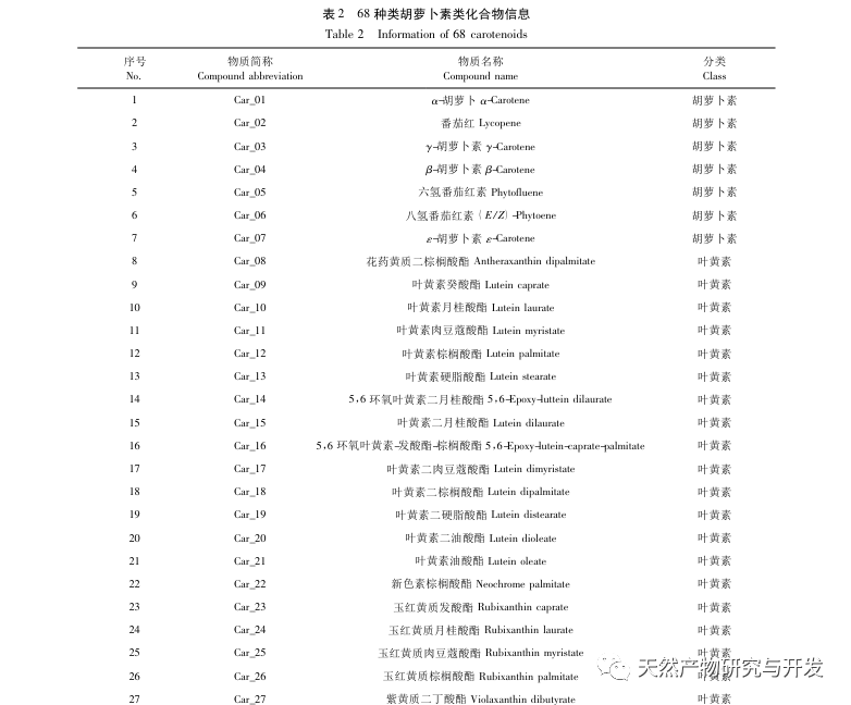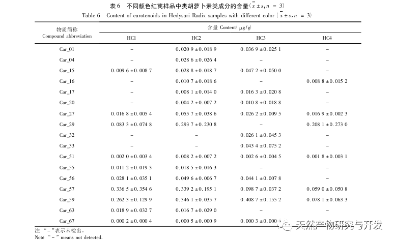 Таким образом, существуют значительные различия в цветовых показателях образцов астрагала коричнево-желтого, красновато-коричневого, красновато-коричневого и желто-коричневого цветов. Существует корреляция между цветовой ценностью и содержанием каротиноидных метаболитов. Среди образцов четырех цветов существует 17 типов каротиноидных компонентов с максимальными и минимальными значениями, и распределение содержания отличается; дифференциальные метаболиты, участвующие в четырех цветах, включают две категории каротиноидов и 11 типов лютеина, а именно α - каротин, β - каротин, лютеин дилаурат, лютеин димерный эфир кислоты, фиолетово-желтый бутират, фиолетово-желтый мускатный эфир, пыльник желтый, зеаксантин, фиолетово-желтый, лютеин, и β - криптоксантин лауриновая кислота. Это одно из красящих веществ, придающих цвет красному астрагалу. Окраска образцов коричнево-желтого, красновато-коричневого, красновато-коричневого и желто-коричневого красного астрагала может быть связана с содержанием и типами каротиноидных метаболитов, упомянутых выше.
