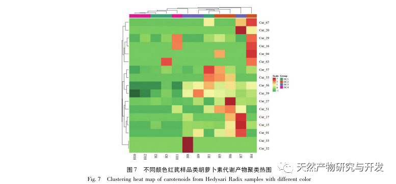 Метод сочетания проекции важности переменных VIP и множественных значений разности в модели OPLS-DA был использован для скрининга различных окрасок красного астрагала на наличие каротиноидных метаболитов. Результаты показали, что было 6, 4, 4, 5, 6 и 6 дифференциальных метаболитов каротиноидов, вовлеченных в HC1 коричневый и HC2 красно-коричневый, HC1 коричневый и HC3 красно-коричневый, HC1 коричневый и HC4 желто-коричневый, HC2 красно-коричневый и HC3 красно-коричневый, HC2 красно-коричневый и HC4 желто-коричневый, HC2 красно-коричневый и HC4 желто-коричневый, HC3 красно-коричневый и HC4 желто-коричневый, соответственно. Дифференциальные метаболиты, участвующие в четырех цветах, в основном состояли из 10 веществ, включая альфа-каротин, бета-каротин и лютеин. Эфир лауриновой кислоты, эфир димерной кислоты лютеина, пурпурно-желтый эфир изобутирата, пурпурно-желтый эфир миристиновой кислоты, пыльник желтый, зеаксантин, пурпурно-желтый, лютеин.