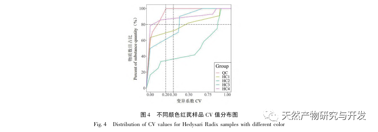 Результаты исследования PCA показывают, что в распределении каротиноидных компонентов среди четырех образцов красного астрагала сосуществуют перекрестная и общая информация. Характеристики изменения цвета лекарственного сырья Хунци связаны с метаболитами каротиноидов, а компоненты каротиноидов вносят свой вклад в формирование цвета лекарственного сырья Хунци. Результаты HCA показали, что согласованность между субъективной классификацией цвета и классификацией каротиноидных метаболитов была невысокой, а кластеризация не была строго основана на четырех цветах. Типы каротиноидных метаболитов в образцах разных цветов имели определенную степень сходства. В образцах лекарственного растения Хунци одного цвета наблюдались различия в содержании каротиноидных метаболитов, а между цветом и содержанием каротиноидных метаболитов существовала определенная связь. Разные по цвету образцы Хунци имели разные метаболиты, что совпадало с результатами, полученными методом PCA.