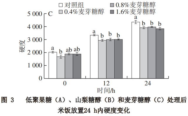 Cooked rice after steaming had the fastest aging rate within 24 h, and then leveled off at a later stage. Experiments were conducted to analyze the changes in hardness of rice treated with oligofructose, sorbitol and maltitol at 4 ℃ for 24h.