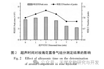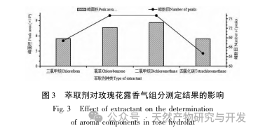 Gaz kromatografisi-kütle spektrometresi teknolojisi ile birlikte ultrason destekli sıvı-sıvı mikroekstraksiyonu kullanılarak acı su gül çiyinin aroma bileşenlerini analiz etmek için bir yöntem oluşturulmuştur. Sıvı-sıvı mikroekstraksiyon yöntemi için optimize edilen parametreler şunlardır: 7.0 mL numune hacmi, 3 dakika ultrason destekli ekstraksiyon süresi, 200 μ L diklorometan ekstraksiyon maddesi ve dozajı, asetonitril dağıtıcı ve 1:2 ekstraksiyon maddesi / dağıtıcı hacim oranı. Optimize edilmiş parametreler altında, gül hücre suyunda 52, gül suyunda 42, taze çiçek suyunda 46 ve salamura çiçek suyunda 47 olmak üzere gül çiyinde toplam 62 aroma bileşeni tespit edilmiştir. Nispeten yüksek içeriğe sahip aroma bileşenleri arasında sitronellol, hidroksisitronellol, öjenol, linalol, α - terpineol, feniletanol, nerol, geraniol, metil öjenol vb. bulunmaktadır. Gül hücre sıvısının, farklı işleme teknikleriyle elde edilen gül suyunun ve farklı üreticilerin gül suyunun aroma bileşenlerinin göreceli içeriği ve bileşiminde farklılıklar vardır. Deneysel sonuçlar, gül çiyinin karakteristik aromasının incelenmesi ve geliştirilmesi için teorik bir temel sağlamaktadır. Gül çiyindeki aroma bileşenlerinin ekstraksiyonu için basit işlem, düşük maliyet, yüksek zenginleştirme faktörü ve iyi tekrarlanabilirlik avantajlarına sahip olan dağılmış sıvı-sıvı mikroekstraksiyon teknolojisi kullanılmıştır. Büyük miktarlarda gül çiği örneklerinin belirlenmesi ve analizi için kullanılabilir.