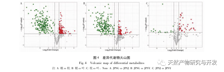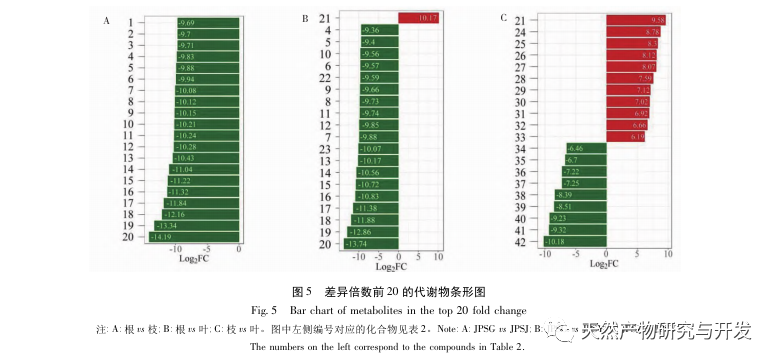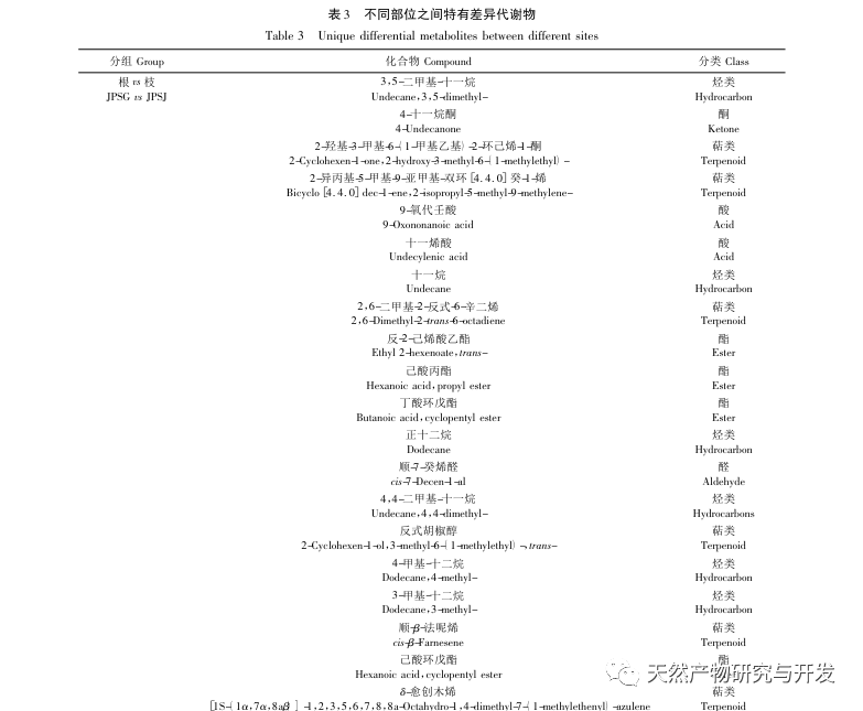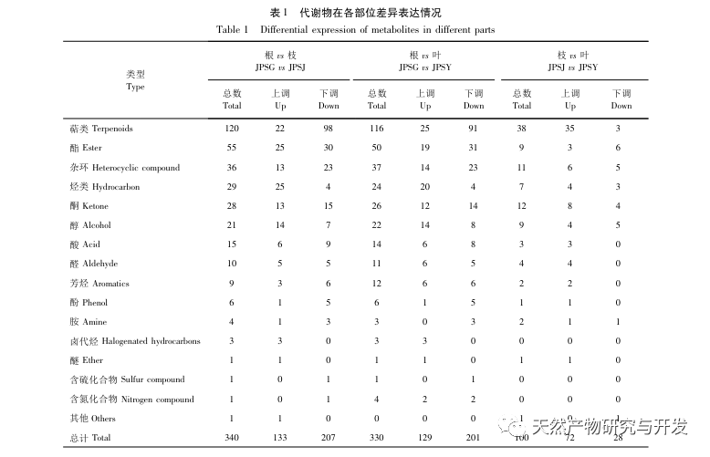 Kökler ve dallar, kökler ve yapraklar arasındaki diferansiyel metabolitler terpenler, esterler, heterosiklik bileşikler, hidrokarbonlar ve alkollerdir; bunlar arasında terpenler, esterler, heterosiklik bileşikler ve aşağı regüle edilen modlar ana olanlardır ve köklerde önemli ölçüde azalmıştır; Hidrokarbonlar ve alkoller arasındaki diferansiyel metabolitlerin yukarı regülasyonu baskındır ve bu iki madde türü köklerde önemli ölçüde yukarı doğru birikir. Dallar ve yapraklar arasındaki diferansiyel metabolitlere yukarı regüle edilen modlar hakimdir ve terpenler ana yukarı regüle edilen bileşenlerdir.