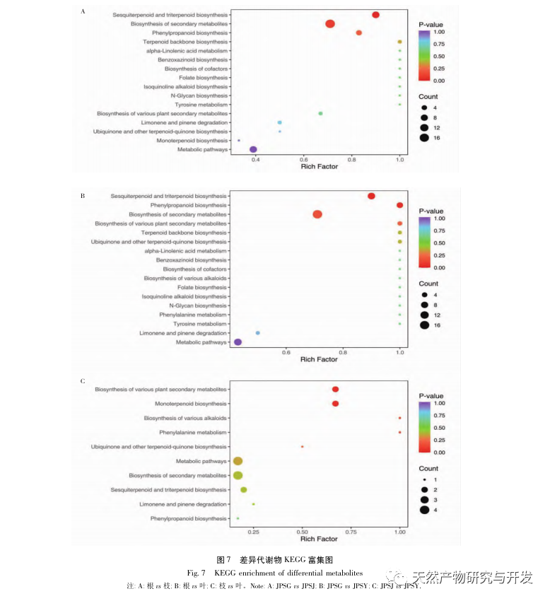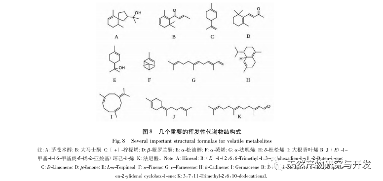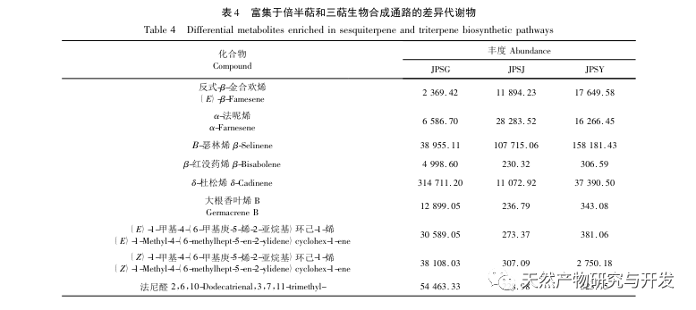Diferansiyel metabolit metabolik yollarının analizine göre, diferansiyel metabolitler seskiterpenler ve triterpenlerin biyosentez yollarında önemli ölçüde zenginleşmiştir. Trans - β - farnesene, α - farnesene, β - selenene ve β - myrrh dahil olmak üzere dokuz diferansiyel metabolit bu sentetik yolda yer almaktadır. Seskiterpenler ve triterpenlerin biyosentetik yolları terpenoid sentezi için önemli yollardan biridir. Farklı kısımlardaki terpenoid içeriğindeki farklılıklar, terpenoid ile ilgili genlerin düzenlenmesi ve ilgili enzimlerin katalizi ile yakından ilişkilidir. İlgili düzenleyici genler üzerinde daha derinlemesine araştırmalara ihtiyaç vardır.
