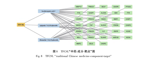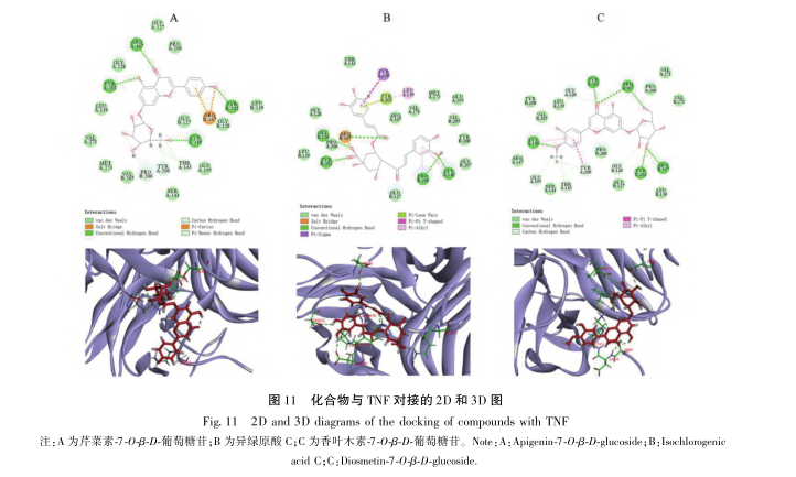 Discovery Studio yazılımının moleküler kenetlenme sonuçlarının analiz edilmesi ve karşılaştırılmasıyla, TFCSL'deki üç ana aktif bileşenin TNF ve CASP3 ile nispeten kararlı bağlanma aktivitesine sahip olduğu bulunmuştur. Daha ileri tarama ve docking sonuçları sayesinde, üç bileşen ile TNF ve CASP3 proteinleri arasındaki etkileşimde yer alan kalıntıların çoğunun aynı olduğu bulunmuştur. Bunlar arasında, birden fazla reseptör etkileşimi türü ve güçlü etkileri olan ortak kalıntılar esas olarak SER9 LYS11、PRO12、ALA156、ASP10、LYS11, Reseptörlerin aktif bölge kalıntıları olabileceği sonucuna varılmıştır.