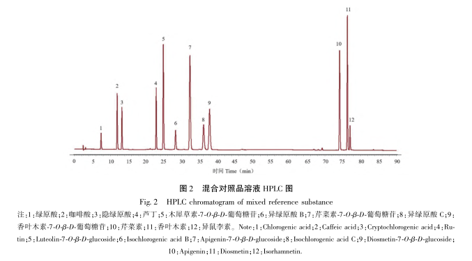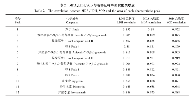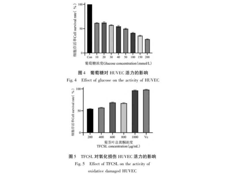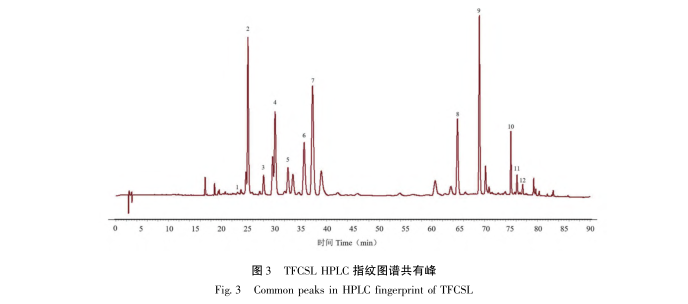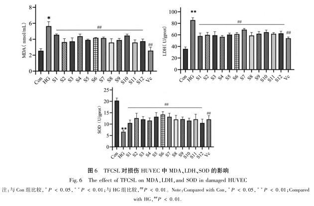 Bu çalışmada 12 parti TFCSL numunesi için HPLC parmak izi spektrumları oluşturulmuş, 12 ortak pik belirlenmiş ve standart numuneler kullanılarak 9 pik tanımlanmıştır. Yüksek şeker koşulları altında, HUVEC hasar görebilir ve fizyolojik faktör salgılanması bozulabilir, bu da hücre apoptozunu teşvik ederek, süpernatanttaki LDH ve MDA içeriğini önemli ölçüde artırarak ve SOD aktivitesini önemli ölçüde azaltarak kendini gösterir. TFCSL ile tedaviden sonra, hücre apoptozunu önemli ölçüde inhibe etmenin yanı sıra, oksidatif stresle ilgili faktörlerin seviyelerini de iyileştirebilir ve HUVEC'in normal fizyolojik işlevini koruyabilir. Her bir ortak pik ile antioksidan aktivite arasındaki korelasyonu analiz etmek için gri ilişkisel analiz ve kısmi en küçük kareler regresyonu kullanılarak, pik 5 (apigenin 7-O - β - D-glukozit), pik 6 (izoklorojenik asit C) ve pik 7'nin (vanilin 7-O - β - D-glukozit) TFCSL antioksidan stresinin maddi temeli olduğu tahmin edilmektedir.