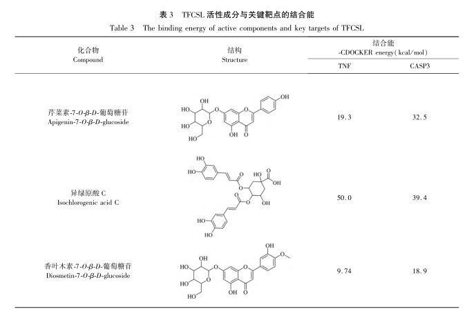 Discovery Studio yazılımının moleküler kenetlenme sonuçlarının analiz edilmesi ve karşılaştırılmasıyla, TFCSL'deki üç ana aktif bileşenin TNF ve CASP3 ile nispeten kararlı bağlanma aktivitesine sahip olduğu bulunmuştur. Daha ileri tarama ve docking sonuçları sayesinde, üç bileşen ile TNF ve CASP3 proteinleri arasındaki etkileşimde yer alan kalıntıların çoğunun aynı olduğu bulunmuştur. Bunlar arasında, birden fazla reseptör etkileşimi türü ve güçlü etkileri olan ortak kalıntılar esas olarak SER9 LYS11、PRO12、ALA156、ASP10、LYS11, Reseptörlerin aktif bölge kalıntıları olabileceği sonucuna varılmıştır.