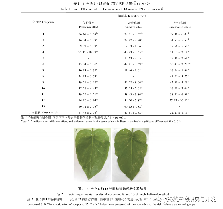 Bu çalışmada, Senecio asiatica'nın etil asetat ekstraktından 13 monomerik bileşiği izole etmek için modern ve etkili fitokimyasal ayırma yöntemleri kullanılmıştır. Bileşik 7 ve 10 hariç, diğer tüm bileşikler Senecio asiatica'dan ilk kez izole edilmiştir. Anti-tütün mozaik virüsü aktivite testinin sonuçları, bileşik 8'in TMV ile enfekte tütün yapraklarının koruyucu etkisi üzerinde Ningnanmycin'den önemli ölçüde daha yüksek bir inhibitör orana sahip olduğunu göstermiştir; Bileşik 1, 4, 9-13, Ningnan mycin ile karşılaştırıldığında Xinye tütününe karşı koruyucu etkilerde önemli bir fark göstermemiştir, bu da bu bileşiklerin tütünün virüslere karşı bitki sistemik direnci kazanmasına neden olabileceğini göstermektedir. Bileşik 13'ün tütün enfeksiyonu TMV'nin terapötik etkisi üzerindeki inhibitör oranı Ningnanmycin'den daha yüksektir; Bileşik 9'un inhibisyon oranı Ningnanmycin ile karşılaştırıldığında önemli bir fark göstermemiştir. Bileşik 8 ve 9'un TMV üzerindeki in vitro inaktivasyon etkisinde Ningnanmycin'in inhibisyon oranına kıyasla önemli bir fark yoktu, bu da bu iki bileşiğin anti TMV etkileri göstermek için doğrudan virüs üzerinde etkili olabileceğini göstermektedir.