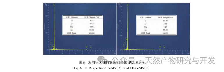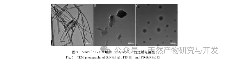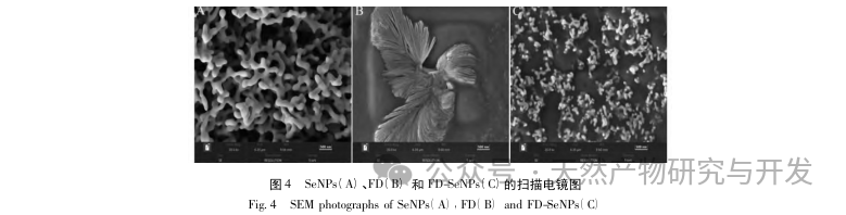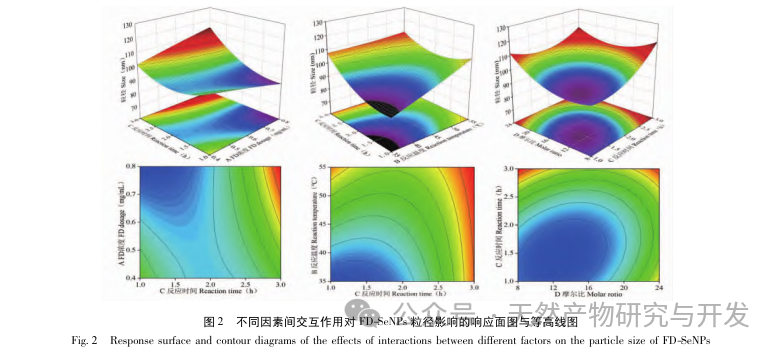 Bu makalede, tek faktör ve yanıt yüzeyi optimizasyon deneyleri yoluyla FD SeNP'ler için optimum hazırlama süreci parametreleri elde edilmiştir; bunlar 35 ℃ reaksiyon sıcaklığı, 1 saatlik reaksiyon süresi, 14:1 askorbik asit-sodyum selenit molar oranı ve 0,8 mg/mL FD konsantrasyonudur. Bu koşullar altında, minimum partikül boyutu (83.40 ± 0.55) nm, potansiyel (-31.89 ± 0.47) mV ve selenyum içeriği 29.93% olarak ölçülmüştür. Yapısının daha ileri düzeyde tanımlanması, FD'nin hidroksil adsorpsiyonu yoluyla SeNP'lerin yüzeyinde düzgün küresel nanopartiküller oluşturduğunu ortaya koymuştur; bu da polisakkaritlerin polar gruplarının SeNP'lerin agregasyonunu etkili bir şekilde inhibe edebileceğini göstermektedir.